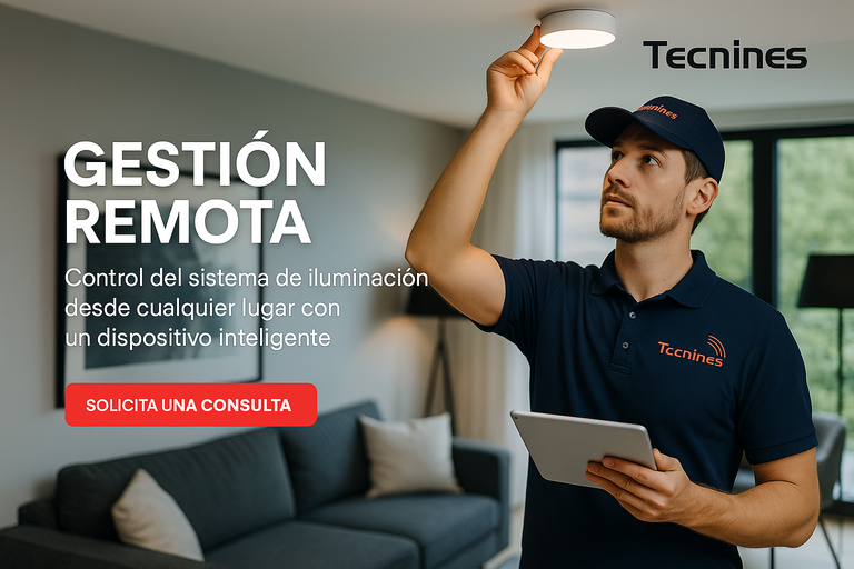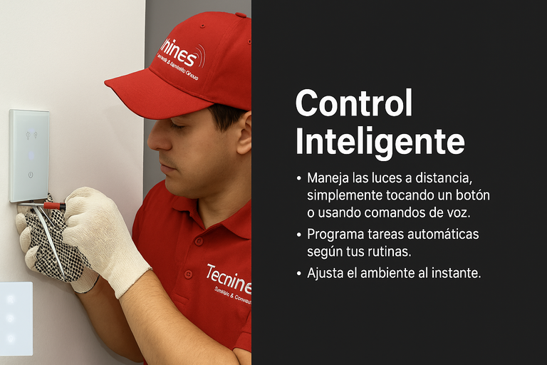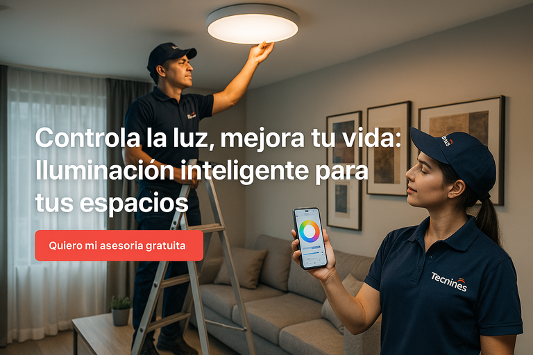 En Tecnines ofrecemos servicios especializados en iluminación inteligente para hogares y oficinas. Nuestras soluciones te permiten controlar la iluminación desde tu celular y crear ambientes personalizados para cada momento del día.
